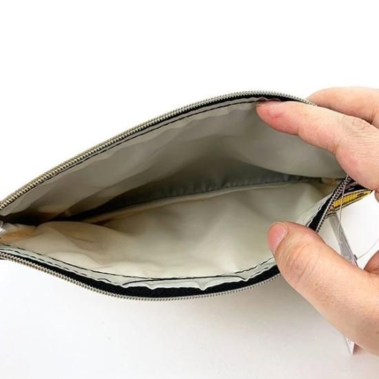 麻風生地がおしゃれなフラットポーチ。バスと連動している織りネームがアクセント!
