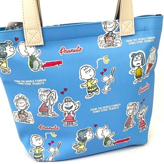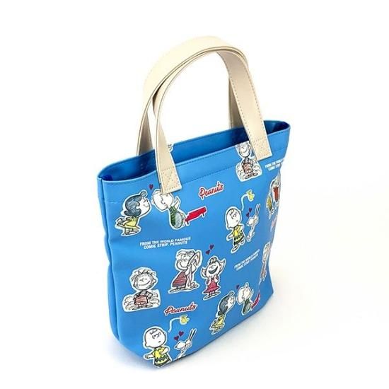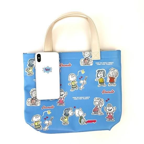 水色のカラーにスヌーピー達イラストがカワイイミニトートです。表面がビニール素材なので、多少の雨でも安心♪