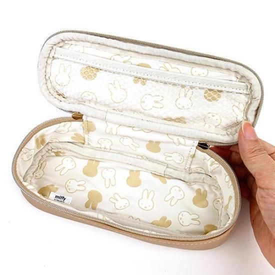 ミッフィーのフェイス柄がかわいいペンケースです。内側にメッシュポケット付。内生地はおしゃれなレピア織仕様で、ミッフィー型の引手もポイントです♪