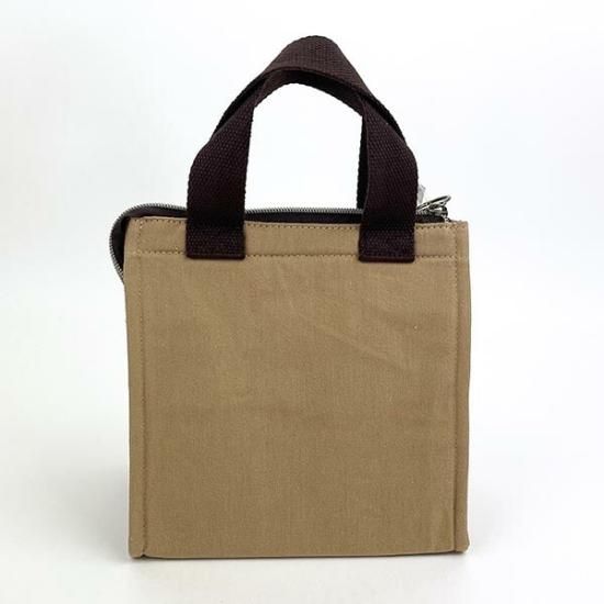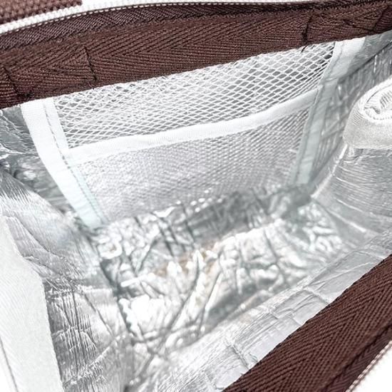 キャラクターのワッペンがついてとってもかわいい。お弁当を傾けないで入れられるように大きなマチが付いたトートバッグです。中はアルミ蒸着仕様、保温保冷の効果があり、保冷剤を入れられるメッシュポケットも付いていて、暑い時期でも安心して使えます。開閉部はファスナー仕様で、末端はボタンで本体に留めてあるので、開ける時は外せば大きく開き、閉じた後は邪魔にならないようにバッグに固定できます。使いやすいお手頃なサイズ感です。