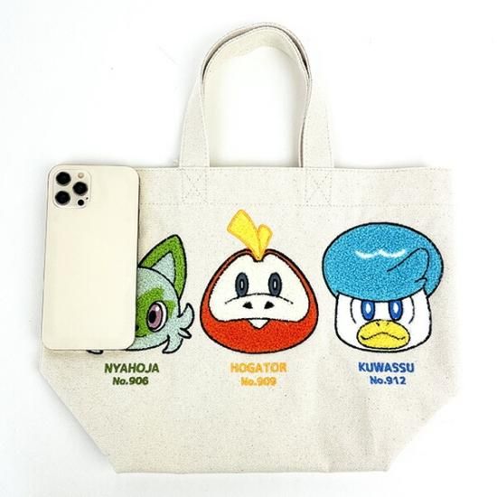 ランチやちょっとした外出に便利なトートバッグだよ!ポケモン達の顔がサガラ刺繍でデザインされているよ♪