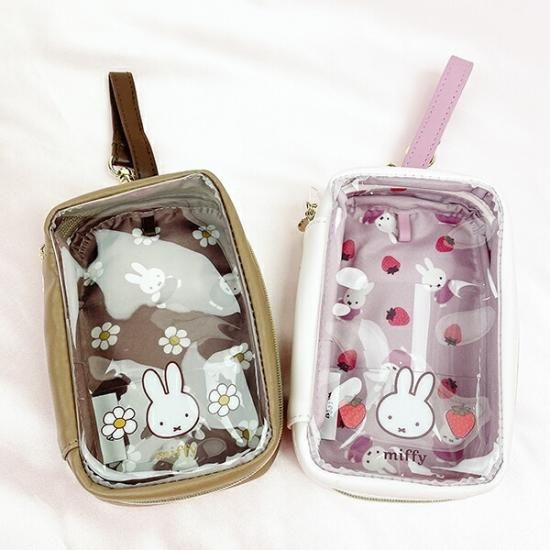 ミッフィーといちごのデザインのプチキャリーポーチです。エナメルの光沢感がおしゃれで、片面がクリア仕様でかわいいポーチ☆開け口が大きく出し入れがしやすいく使いやすいですね♪中に入れたものでいろんな絵柄を楽しめる。内側に透明のポケット2つとカバンに付けられるストラップ付☆ポーチの中でキーホルダーが飾れる吊り下げタグも。ファスナーはかわいいいちごのチャーム仕様。色違いもございますのでチェックしてみてくださいね☆