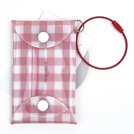 窓からチェキの写真部分がぴったり見えるケースです。厚みがあるので何枚も重ねられるのがポイント☆丈夫なワイヤーキーリング付きでカバンに付けることができます。推しカラーで揃えて持ち歩こう♪